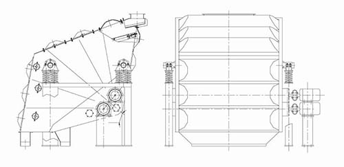 整體結(jié)構(gòu)主要由這幾部分組成:帶分流裝置的進(jìn)料口、支架、帶快速插銷的檢修上蓋、振動(dòng)彈簧,振動(dòng)電機(jī)、篩體等配件組成。振動(dòng)彈簧連接在振動(dòng)支架上,支撐著篩體,振動(dòng)電機(jī)與篩體的安裝橋架進(jìn)行布局安裝。帶快速插銷的檢修上蓋位于篩體上側(cè),方便快捷打開上蓋查看篩網(wǎng)的使用情況。概率篩是根據(jù)雙振動(dòng)電機(jī)自同步直線振動(dòng)原理制成。在振動(dòng)過(guò)程中由電機(jī)產(chǎn)生的縱向激振力(由于兩電機(jī)反向同步轉(zhuǎn)動(dòng)橫向力抵消)使篩體沿水平面成一傾斜角度的方向作直線振動(dòng),從而使物料在篩網(wǎng)上向前不斷地拋物狀運(yùn)動(dòng),達(dá)到篩分目的。各層篩網(wǎng)沿箱體傾斜不同的角度并且相互間隔一定距離進(jìn)行布置。大傾角布置的篩網(wǎng)使得篩網(wǎng)在過(guò)載的情況下也不至于被撕裂。